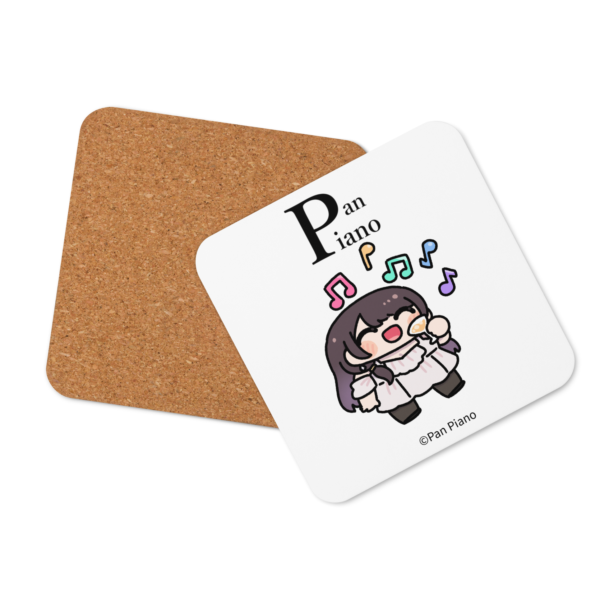 A cute chibi-style Pan Piano singing with a drink in hand, printed on a square cork coaster.